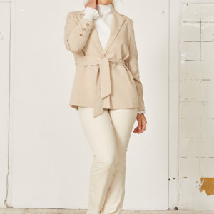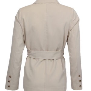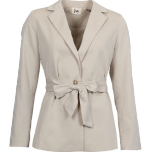 Klassisk blazer i en flot camel farve med revers og 1 knaplukning foran. Der medfølger et bælte som du kan bruge hvis du vil lave en mere markant talje.