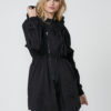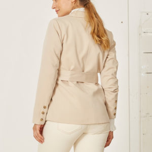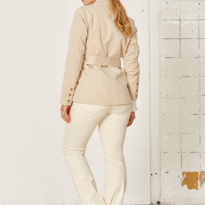 Jakken har lommer i siden, knapper som dekoration på ærmer og bæltstropper. Modellen har skulderpuder og er let rundskåret forneden hvilket giver et feminint udtryk.