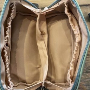 Indvendig er der 3 sidelommer med elastik, 1 rumdeler med lynlås og 2 gode rum til i midten.
