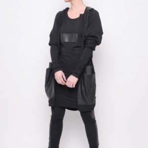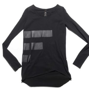 Lang bluse i let a-facon med ” læder ” applikationer og bred rund hals med asymetrisk kantebånd i halsen. Ærmerne har ekstra længde som kan skubbes op til drapering. Blusen har en blød bue op over venstre side og er længere bagpå. Dejlig blød bomuld med stræk.
