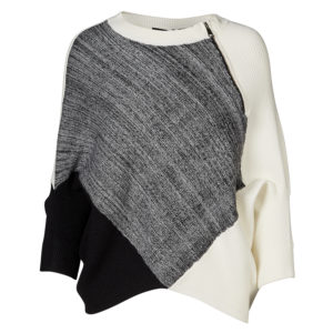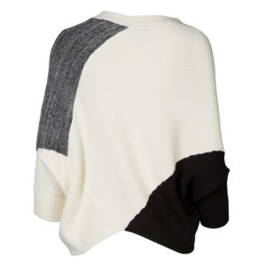 Anderledes og interessant strik bluse, der kombinerer forskellige farver, teksturer og vinkler for et unikt udtryk. Den asymmetriske lynlås detalje tilføjer et råt og moderne præg, mens den løse pasform sikrer komfort hele dagen. Bagsiden viser den interessante sammensætning af farver og materialer, som skaber en iøjnefaldende effekt.