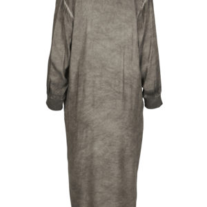Super flot og dejlig let tunika/kjole i camouflage print med lidt sølvglimmer og 3/4 ærmer med ribkant afslutning.( så bestemmer du selv ærmelængden 🙂 ) Modellen er Cold dyed og har derfor et unikt farveprint i den grå bundfarve og kan variere lidt i farvenuancerne end på billedet. Der er lommer i sidesøm – 10 cm slids i begge sider og så er den rundskåret og lidt længere bagtil. Kjolen slanker optisk da camouflage printet bliver mindre og mindre i midten hele vejen ned af kjolen.