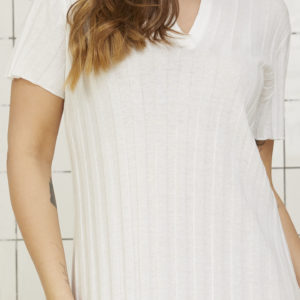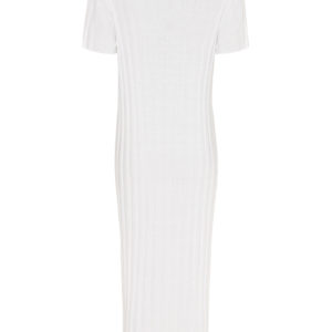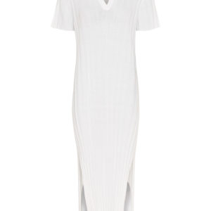 Elegant og let ribstriks kjole med v-hals, korte ærmer og lange slidser i siden.