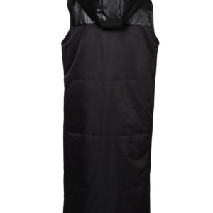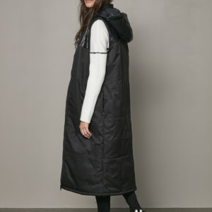 Lækker lang vest der kombinerer funktionalitet med et moderne design, og holder dig varm omkring benene, hvilket gør den perfekt til kølige dage. Materiale mikset giver et unikt udtryk, mens lynlåsen foran og den justerbare hætte tilføjer praktiske elementer. Der er 2 gode lommer med lynlås i siderne. Vesten er ideel til lag-på-lag styling, fx. over en striktrøje og leggings eller et par stramme bukser.