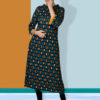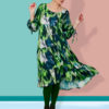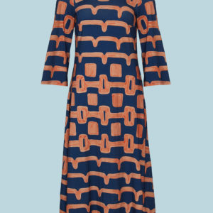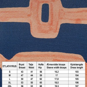Skøn klassisk kjole i A-facon med drypeffekt i siderne i et flot grafisk print. Kjolen har flot stående krave og 7/8 lange ærmer, som afsluttes med en bred karryfarvet manchet. Modellen har stiklommer i siden og sidder rigtig flot da den ligger til over barmen og har god vidde til mave og hofter.