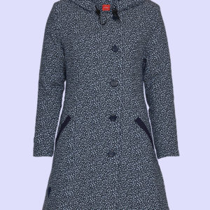 Super flot vævet jakke med foer i blåt/ hvidt print. Jakken er figursyet, har lommer i siden med kontrastkant og en indvendig manchetkant i samme farve for at undgå det blæser ind. Modellen har gennemgående skjult lynlås og 5 blå knapper. Hætten er dejlig rummelig og har et snoretræk for indstilling af størrelsen. Hele herligheden prydes med et håndhæklet blåt farvet hjerte i højre side forneden.