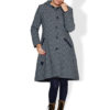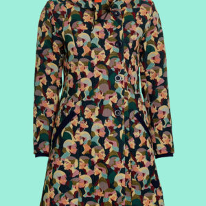 Super flot vævet jakke med foer i et skønt print med kvinder. Jakken er figursyet, har lommer i siden med kontrastkant og en indvendig manchetkant i samme farve for at undgå det blæser ind. Modellen har gennemgående skjult lynlås og 5 blå knapper. Hætten er dejlig rummelig og har et snoretræk for indstilling af størrelsen. Hele herligheden prydes med et håndhæklet blåt farvet hjerte i venstre side forneden. Jakken kan holde dig godt varm 🙂
