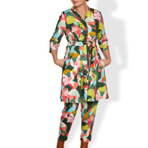 Printet buks med lige ben i skønt kvinde print og glade farver. Buksen har linning med elastik bag og lommer foran.