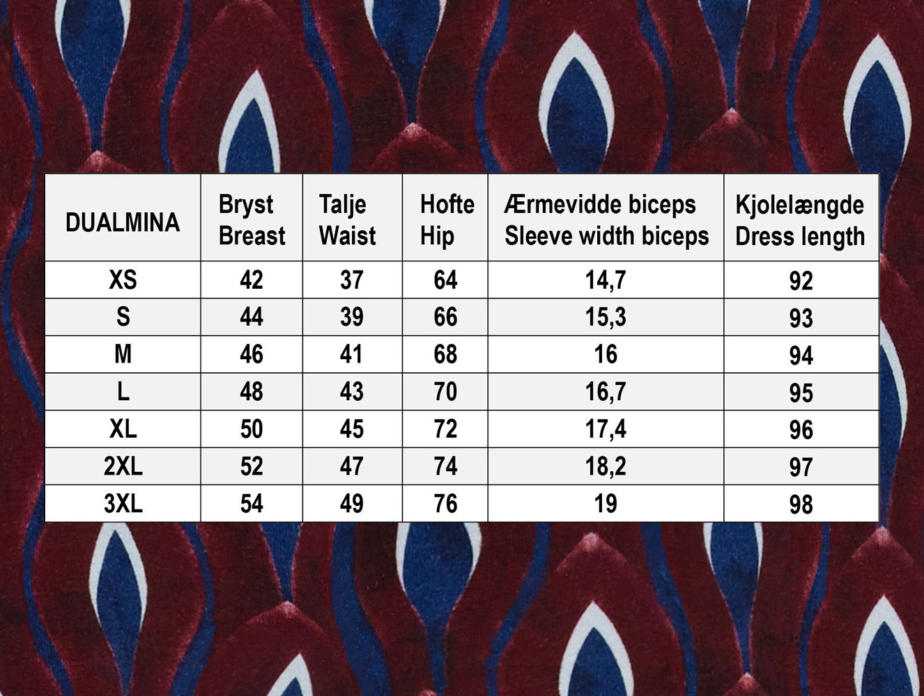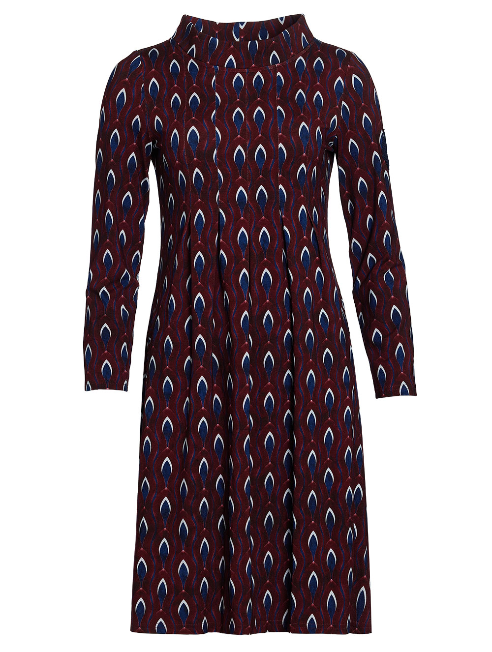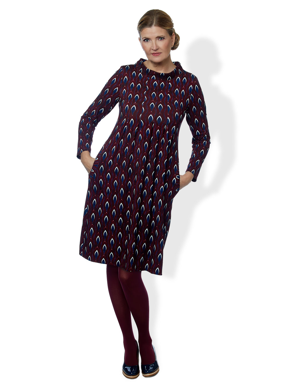 Den fine Almina-model i et flot grafisk print i bordeaux, hvis og blå. Modellen sidder til ved barmen og har klædelige wienerlæg neden under, som giver god vidde om mave og hofter. Modellen har stående krave, lommer i sidesøm,. lange ærmer og der sidder det fineste håndhæklede blå broderi som dråbe på venstre ærme.