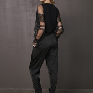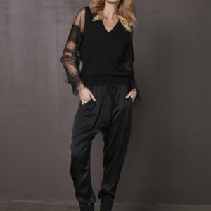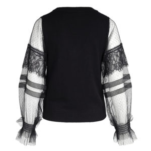 Fantastisk flot sort strik med transparente ærmer som har prikker og volange kanter forskellige steder samt smock elastik. Striktrøjens bløde materiale sikrer, at den både er behagelig og stilfuld