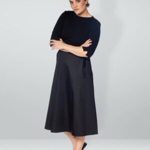 Midnatsblå kjole med det skønneste græskarprint og et orange farvet hjerte-spænde der pryder taljen. Kjolen har empiresnit og let A-facon – og er syet på kryds i halsudskæringen og en flot revers er igen pyntet med knapper. Ærmerne er 3/4 lange og har flot puf. En rigtig Margot fuld af hendes DNA.