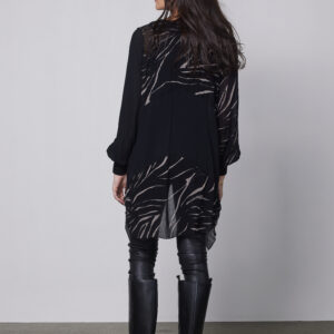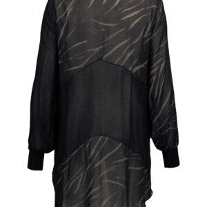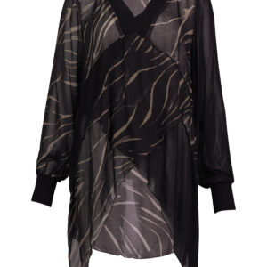 De lange, transparente ærmer med ribkantmanchetter og de asymmetriske lag skaber en flatterende og dynamisk silhuet.