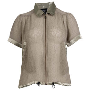 Denne bluse er let transparent og har korte ærmer, som giver et luftigt og sommerligt udtryk. Den har gennemgående lynlås foran, krave i blank finish og matchende satin-detaljer ved ærmer og kant, der tilføjer en elegant kontrast.