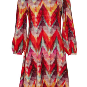 Zig Zag printet kjole i den populære duCaroline model, som sidder til over barmen og falder blødt om mave og hofter. Kjolen har 7/8 lange ærmer som er afsluttet med bindebånd og let puf. Modellen er pyntet med 1 håndhæklet stort rødt hjerte forneden i venstre side og der er stiklommer i siden. Mega sød kjole – hvor det er så nemt at tilsætte andre farver, hvilket du også kan se på vore forslag 🙂
